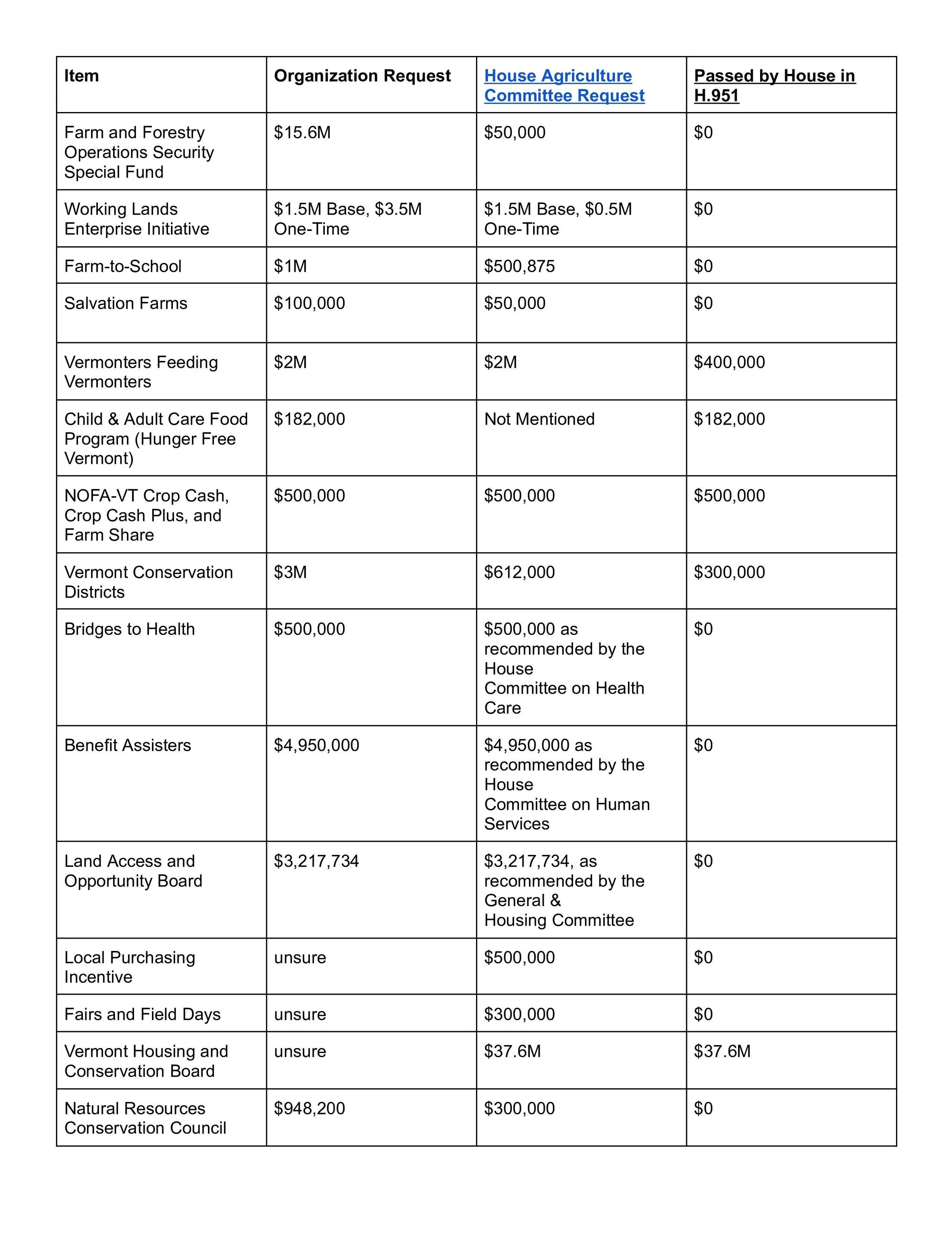 H. 951 is the budget bill. The Fiscal Year 2027 agricultural appropriations are summarized below. H.951 passed the House on 3/27/26. While not all funding requests have been included in H.951, it is unclear at this time which relevant funding items might still be covered by earlier appropriations under prior legislation.